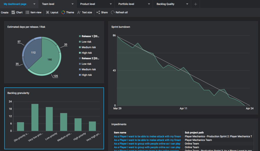 No two organizations have the same need for decisions and metrics. Helix Plan's powerful and flexible Business Intelligence enables users to navigate their road to success with confidence. Customized dashboards track the metrics important to your team and can be updated as you learn. The pre-made widgets in other Agile tools tend to capture standard metrics for flow and iteration based methods, but flexibility and customization of graphs are necessary for anyone demanding maximum insight from their Agile data.