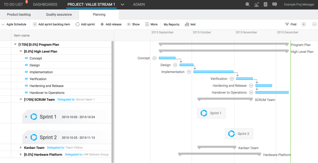 Scrum, Kanban, Waterfall, Scrumban. In reality, most organizations are not evangelists for a single method but choose to mix a number of them. With Helix Plan, you can allow for different methods, side-by-side or interlinked, within the same project (even mixing Gantt with Agile), but still have everyone collaborating to meet the same milestone. Regardless of method, progress can be tracked across teams and features can be pulled from a joint backlog.
