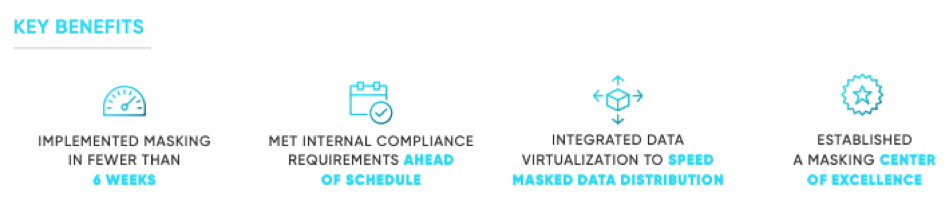 - They completed the implementation process in 6 weeks, meeting compliance requirements ahead of schedule.The team estimated that competitors’ tools would have taken an estimated 18-24 weeks to install and start masking data with.