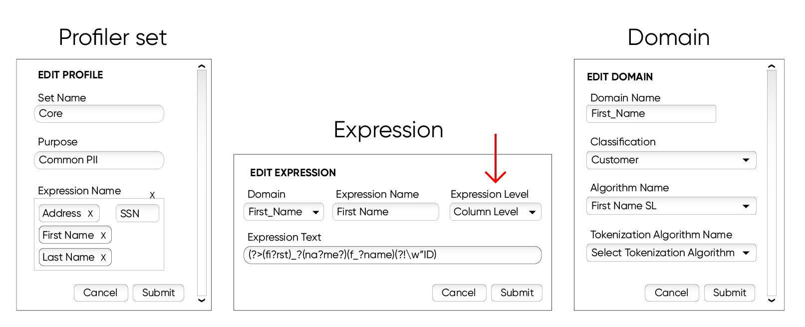 From there, the domain ties the search expression to an algorithm. The masking security policy is implemented by grouping the search expressions into the profiler set, and these constructs that implement the security policy within Delphix masking are managed in the settings tab of the UI.