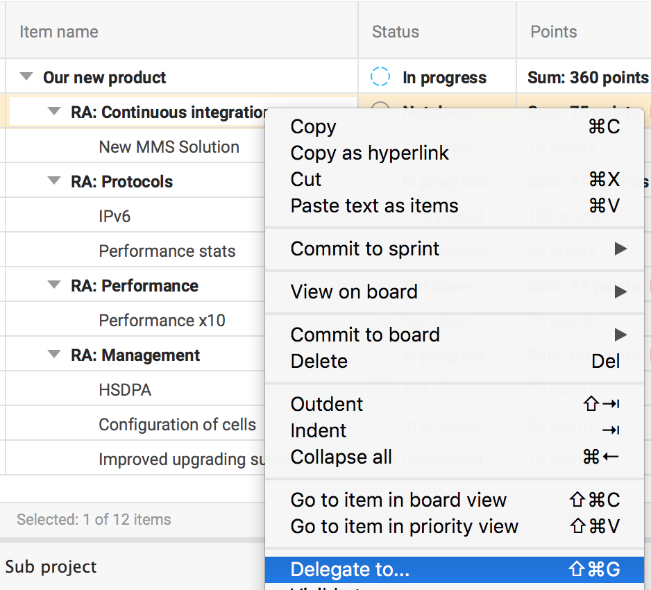 Your area product owners are typically responsible for a specific customer-centric area of the product. As the product owner, delegating a requirement area in the backlog to an area product owner allows him or her to work freely in that area of the backlog while you, the product owner, retain control over items higher in the hierarchy. Delegation also prevents area product owners from accidentally changing priorities or other data in requirement areas they are not responsible for. To delegate a requirement area in P4 Plan, simply right-click the top-level item and select “Delegate to...”. You can delegate parts of the backlog to both groups and individuals.