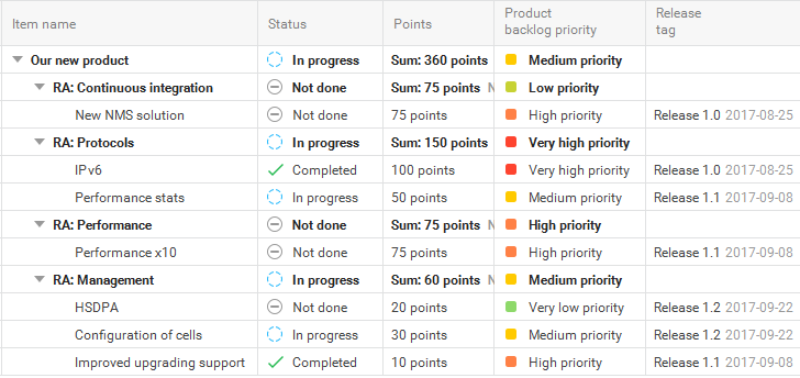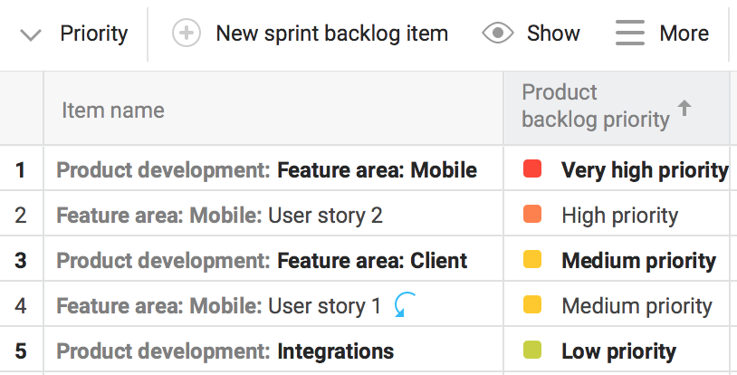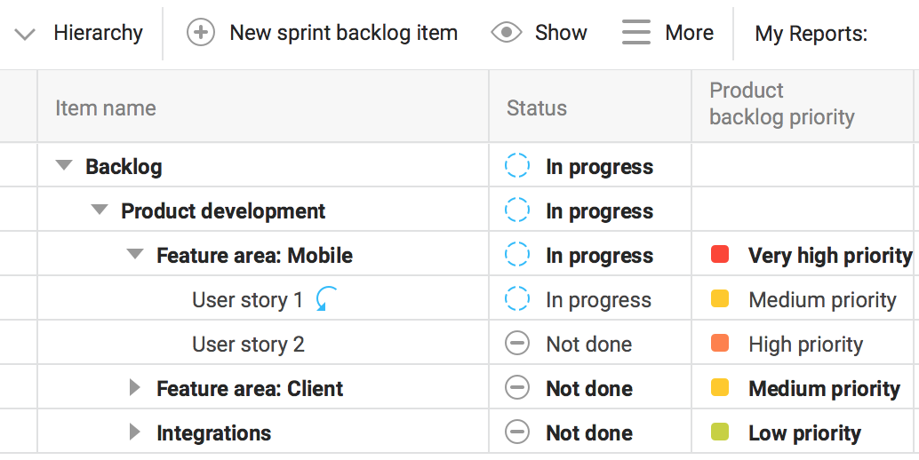 The hierarchy view is a great way to structure the backlog for high-level business goals and insights, from requirement areas down to separate product backlog items. It allows the product owner to drill down into specific areas and into individual product backlog items to shift between high- and low-level views of the current backlog status.