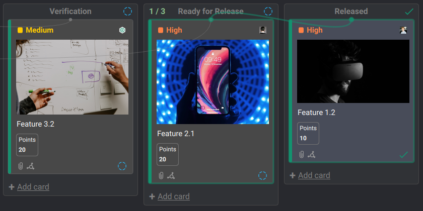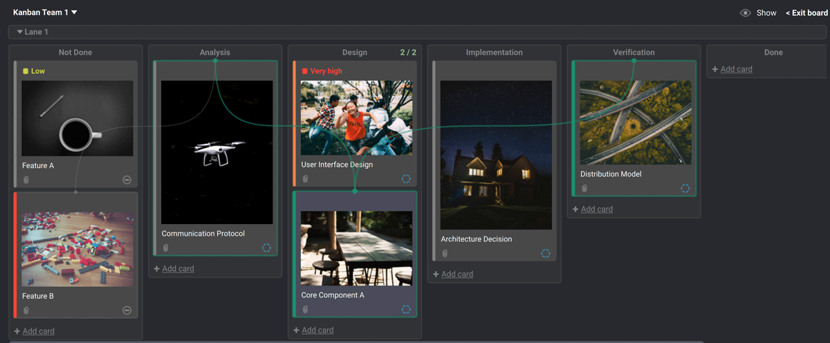 Every work item is visualized as a separate card placed on the Kanban board. The main purpose of the card is to give team members something to track as it moves throughout the workflow. This makes otherwise-invisible knowledge work visible and more tangible.