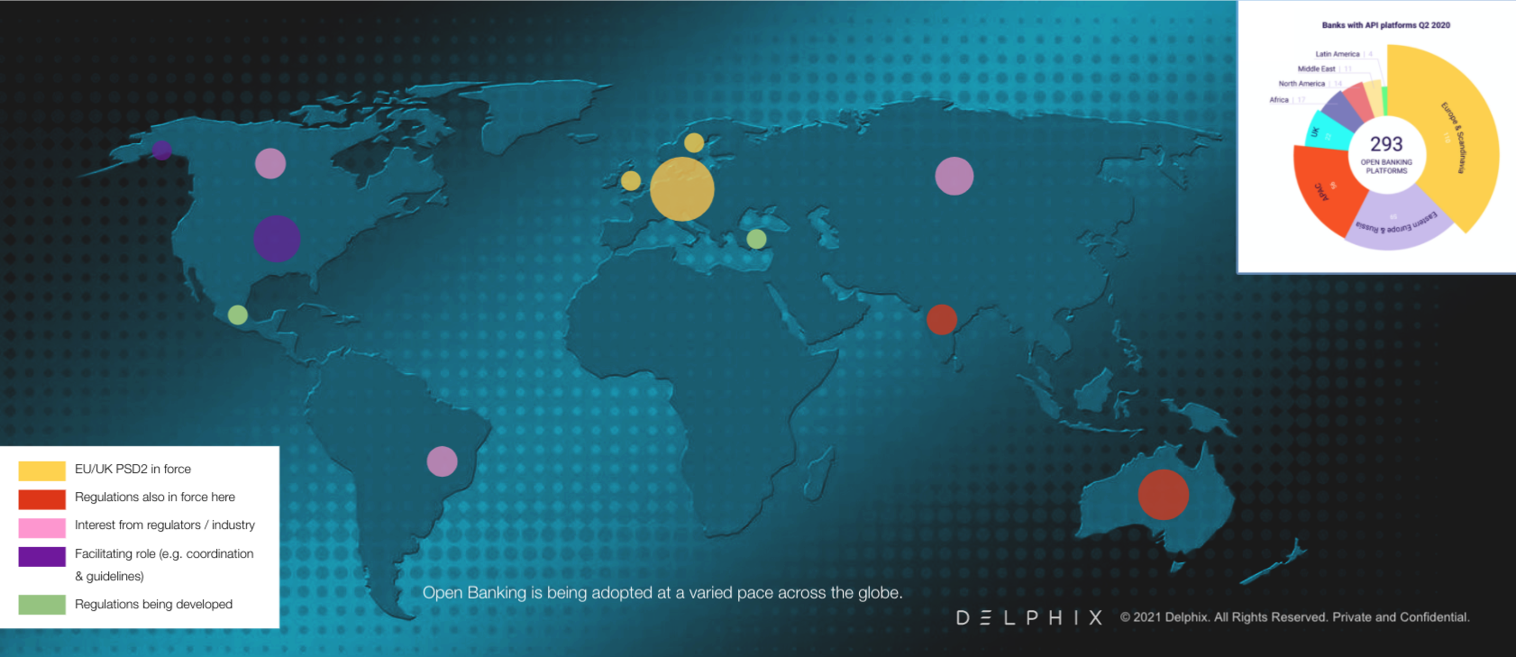 Open banking is being adopted at a varied pace from Canada to Australia, as the map shows below. For example, while U.S. authorities have not mandated open banking yet, they have blessed it and allow TPPs to gather information, fueling the rise of fintech beacons, such as Stripe and Square. So far, it's been up to the market to decide what to do, but there are strong signs that will change soon.