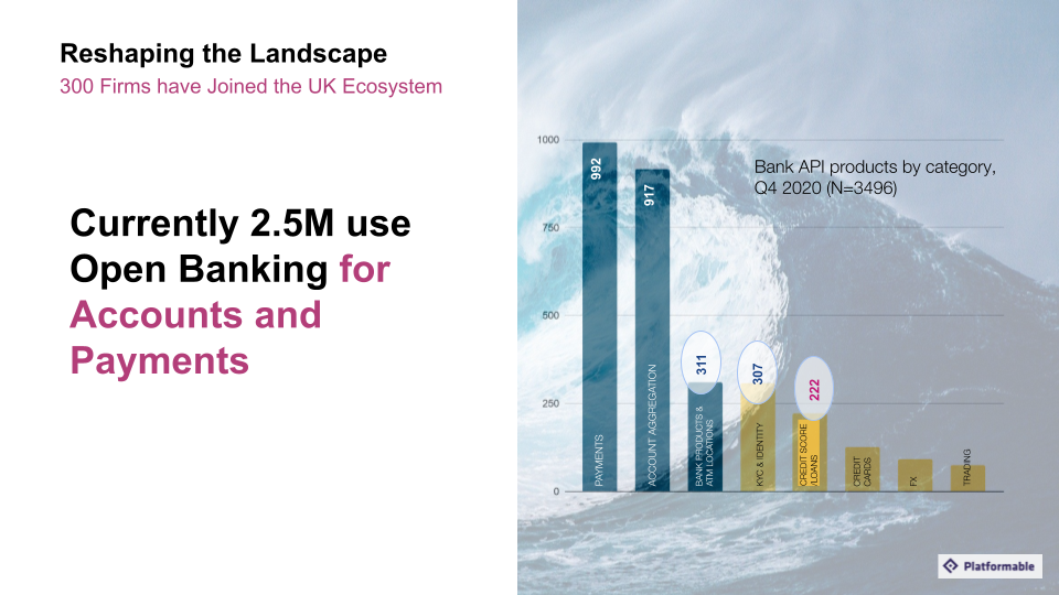 The Open Banking Implementation Entity (OBIE) reports that 2.5 million consumers and small and medium enterprises (SME) in the U.K. use open banking-enabled products to manage their finances, access credit, and make payments. As the chart shows below, some advanced use cases that have seen less traction can be potentially transformative for banks.
