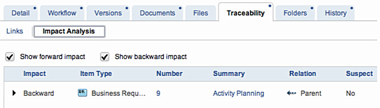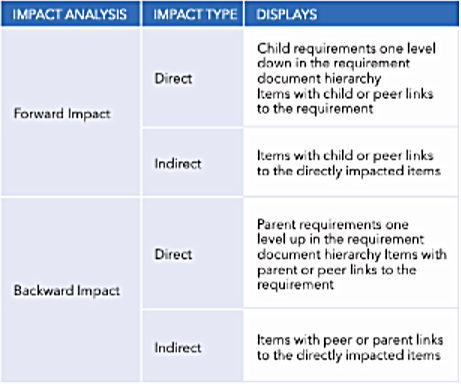 Backward impact analysis determines the parent requirements and other dependent items that may be affected by requirement changes. For example, a suggested change to a child requirement may conflict with its parent requirement, or a feature request may affect the requirement created to address it.
