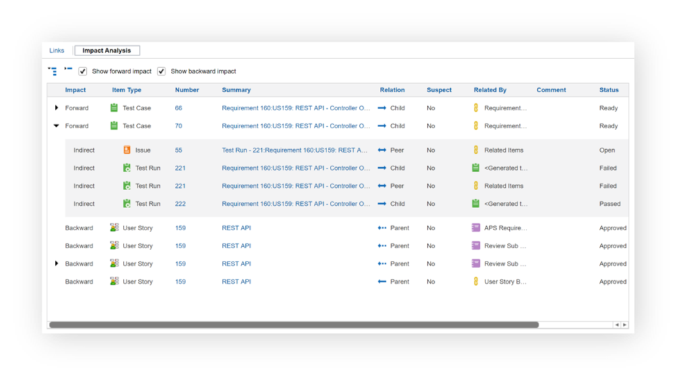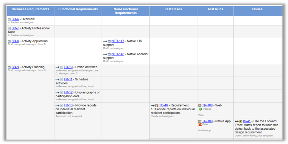 If you structure your requirements with solid parent-child relationships, you make the later critical process of verification much easier on everyone. A requirements traceability matrix, like pictured above in Perforce ALM (formerly Helix ALM), can show clear connections between requirements and their resulting tests and issues. The alternative is to have an ad hoc structure, in which every requirement lives independently — not good when traceability matters.