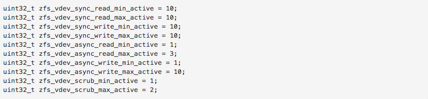 Each of these queues has tunable values for the min and max number of outstanding operations of the given type that can be issued to a leaf vdev (LUN). The tunable zfs_vdev_max_active limits the number of IOs issued to a single vdev. If its value is less than the sum of the zfs_vdev_*_max_active tunables, then the minimums come into play. The minimum number of each queue will be scheduled and the remainder of zfs_vdev_max_active is issued from the queues in priority order.