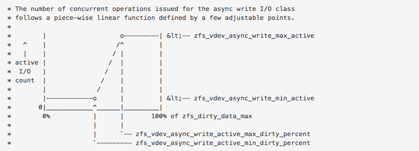 In addition to tuning the minimum and maximum number of concurrent operations sent to the device, there are two other tunables related to asynchronous writes: zfs_vdev_async_write_active_min_dirty_percent and zfs_vdev_async_write_active_max_dirty_percent. Along with the min and max operation counts (zfs_vdev_async_write_min_active and zfs_vdev_aysync_write_max_active), these four tunables define a piece-wise linear function that determines the number of operations scheduled as depicted in this lovely ASCII art graph excerpted from the comments: