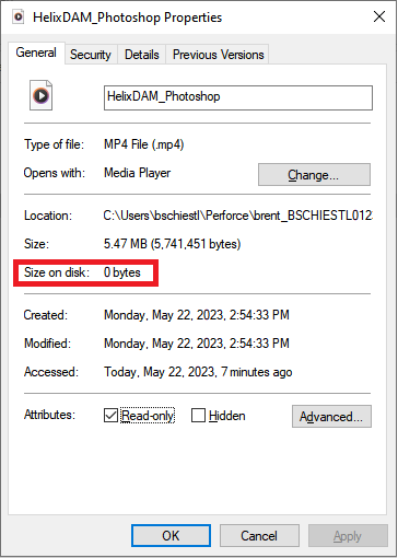 Note that inspecting a specific file that is “metadata only” will reveal a size of 0 bytes on disk:
